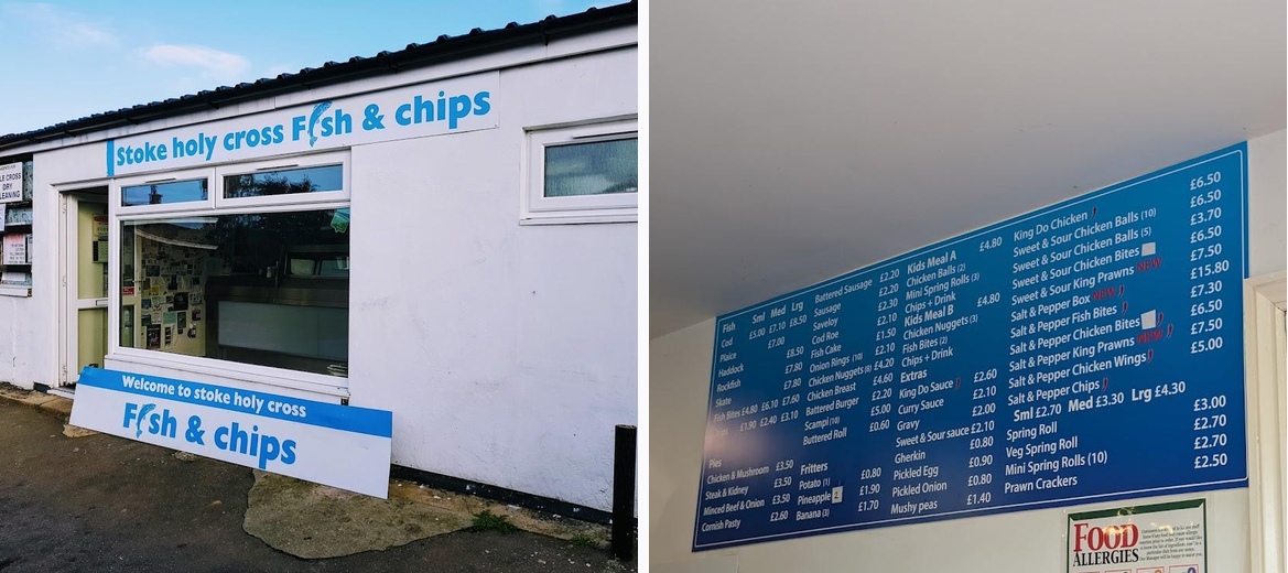 Discover the best fish and chips at Stoke Holy Cross Fish & Chips in Norwich! Enjoy deliciously battered cod, sausages, and more, all at affordable prices. Convenient parking available and we accept credit cards for hassle-free dining. Come taste the local favorite today!